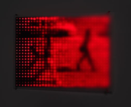 For me, one of the most successful pieces in the exhibition is Jim Campbell’s “Church on Fifth Avenue”, which is part of his Fifth Avenue Series 2001. Simple, yet complex, the piece uses custom-made electronics, and video footage taken in the days directly following 9/11. A grid of 768 pixels made out of red LEDs displays a pedestrian and auto traffic scene in NYC. A sheet of diffusing Plexiglas is attached to one side of the frame and angles away from the grid, causing the moving images to gradually go from a digital representation to an analog one. As a result I found myself attempting to visually grasp the fleeting images of the street scene as they moved across the glowing red screen before becoming too digitized to recognize.