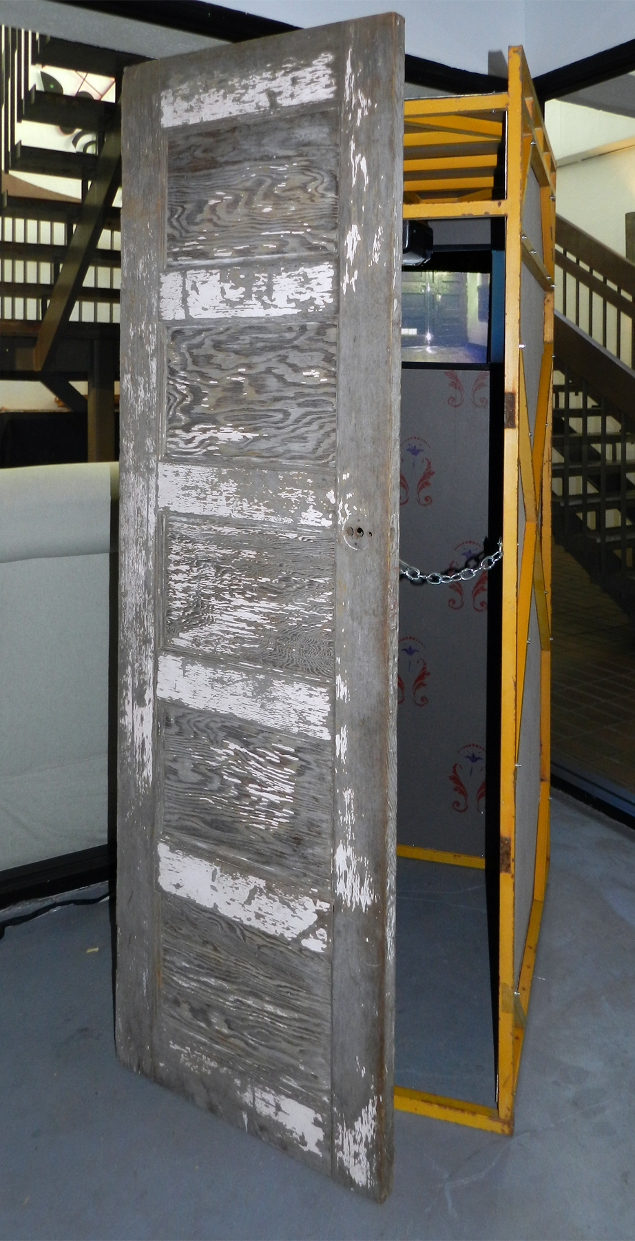 Since it’s not possible to discuss all of the complex works in this show, I’ll mention a brief sampling. In “Paranoimal” (i.e. paranoia the new normal), Elizabeth Sher and Brooke Holve created a small closet-like room with an old wooden door held ajar by a short chain. Peeking inside, you view a video where a woman (Brigit Marie Henry) moves apprehensively down the hall of an old hotel looking into rooms. As she opens each door, she looks in only to find herself looking back at her/us. The video loop becomes a disconcerting sequence involving the viewer as we watch someone watching themself.