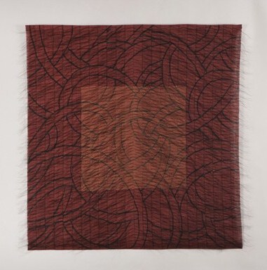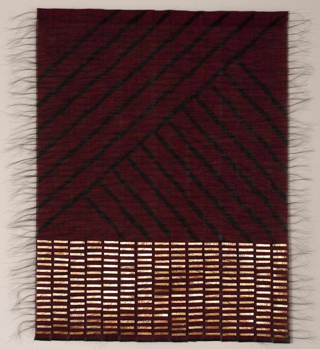 Akers considers herself an artist first, who happens to use fibers and weaving as her medium. This assertion is well supported by the complexity of her materials and process, which results in rich and detailed weavings. She begins with finely woven linen strips that are sewn together. Then additional materials are applied or incorporated. For example she weaves in horse hair, which historically has been used for upholstery fabric, but here adds elements of fine lines that soften the more hard-edge forms. She also applies paints and inks directly to the warp threads, or even to the finished woven cloth. Finally she adds thin bands of metal, which are recycled from the foil seals of wine bottles. These she cuts into narrow strips, then stitches onto the woven linen segments.