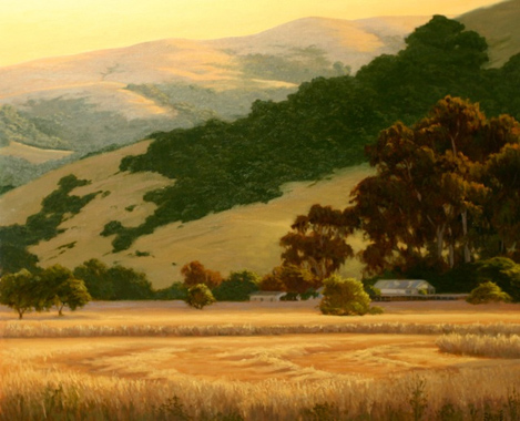 The new exhibition at RiskPress Gallery in Sebastopol is Scenic Journey: Sonoma County and Beyond, paintings by Terry Sauvé. Terry begins her landscapes by painting en plein air, which is a French expression that means “painting out-of-doors”. Typically when an artist works in this way they must be quick and keen observers to capture the scene directly before them, as the light and other conditions can change rapidly. While Terry paints what she sees, she does not simply record the view. By also being attuned to the sounds, smells, and mood of the moment, she interprets the essence of the location with greater depth and insight. For example she may intensify a color, or adjust the composition of shapes and patterns to direct the viewer’s eye. Her soft-hued oil paintings are classic in their composition but contemporary in their uncluttered imagery. A good example of this is California Hills and Fields, where, in the foreground, arcs of freshly cut hay are gently bathed by the late afternoon sun, while the last rays glance off golden hills in the background. Sauvé uses the arcs of cut hay to direct our eyes to the homestead, now in the shadow of the hills. The colors and composition evoke a sense of peace and stillness at the end of a good day’s work. The exhibition continues through January 29. For more information check the gallery’s website, www.riskpress.com, or go to the artist’s website, www.terrysauve.com.