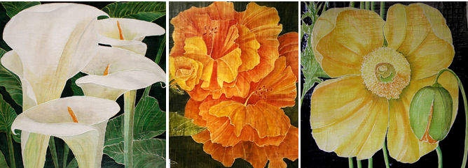 Ahrens’ creates astonishingly intimate floral images on a monumental scale rendered on hand-prepared cracked linen canvases. Her hallmark is bold color and design on fragile like surfaces suffused with the rich historical depth of medieval illuminated manuscripts and the ancient frescoes of Pompeii.