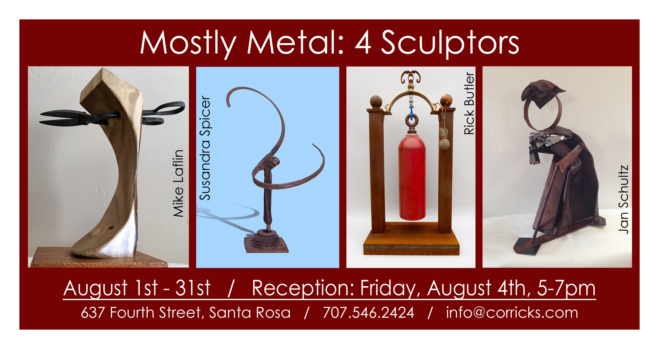 This is a unique art show, featuring four local sculptors: Susandra Spicer, Jan Schultz, Mike Laflin, and Rick Butler.
