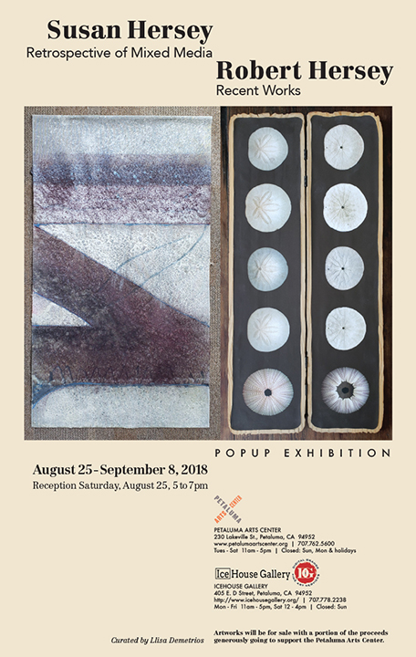 The Petaluma Arts Center in collaboration with the IceHouse Gallery, present a special pop-up exhibition of mixed media work by Susan Hersey, and recent works by Robert Hersey.