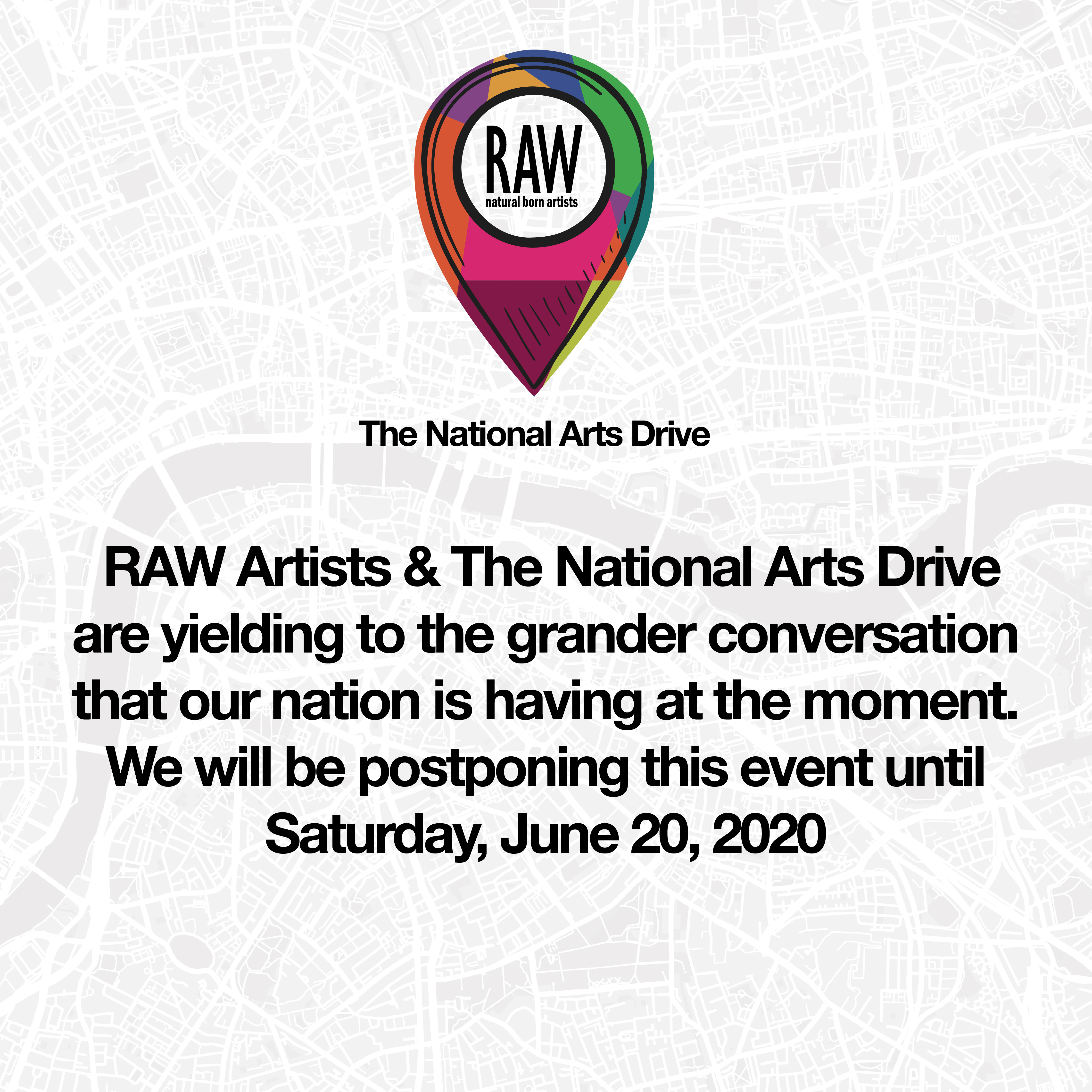 Postponed. As you most likely already know, many cities across the United States are experiencing mass protests for the Black Lives Matter movement. This is a conversation that is long overdue for the country and the world-at-large. In support of those collective voices protesting, we have made the decision to yield The National Arts Drive and postpone the date to Saturday, June 20, 2020.