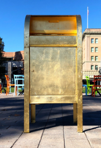 In 2020, during the COVID-19 pandemic, Jessica Rasmussen, Anna Wiziarde, and Julian Billotte opened the first known Portal in Courthouse Square; a gilded mailbox, for letters to the past or future. A small sample of these letters is viewable in this exhibit. Towards the end of the project, the Portal Service was astonished to receive a cease and desist from the United States Postal Service. It was for infringement on USPS intellectual property, i.e.: the similarity of the name and the shape of the iconic collection box.