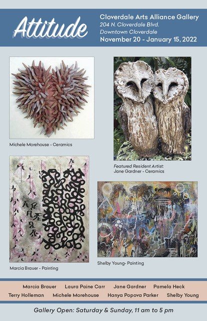Guest artists for this exhibit are Marcia Brauer, Painting; Michele Morehouse, Ceramics; and Shelby Young, Painting. Resident artists are Laura Paine Carr, Jane Gardner, Pamela Heck, Terry Holleman, and Hanya Popova Parker. Jane Gardner, ceramics, is the featured resident artist.