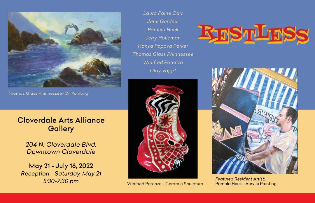 Guest artists for this exhibit are Thomas Glass Phinnessee, Oil Painting; and Winifred Potenza, Ceramic Sculpture. Resident artists are Laura Paine Carr, Jane Gardner, Pamela Heck, Terry Holleman, Hanya Popova Parker and Clay Vajgrt. Pamela Heck, Acrylic Painting is the featured resident.