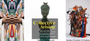 Collective Arising features art by contemporary Black artists who have participated in interdisciplinary collectives, including nure, 3.9 Collective, House of Malico, CTRL+SHIFT, and Black [Space] Residency. Collectives—groups of like-minded individuals coming together to achieve a common goal—have offered space for Black artists to expand their practice, amplify their voices, and nurture one another. The artworks in Collective Arising—which includes textile, sculpture, glass, print, painting, photography, video, and installation—speak to the dual purpose at the core of the formation of artist collectives. Curated by Ashara Ekundayo and Lucia Olubunmi R. Momoh.