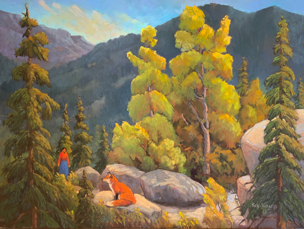 Work by Teri Sloat expressing her inner Fox. Teri says, “The inner part of me is the fox, and, in different forms, the woman is who I am and how I feel. The fox is always there, leading, waiting, reminding me of the importance of stories and dreams.”