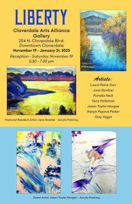 Guest artist for this exhibit is Jason Taylor Morgan, Acrylic Painting. Resident artists are Laura Paine Carr, Jane Gardner, Pamela Heck, Terry Holleman, Hanya Popova Parker and Clay Vajgrt. Jane Gardner, Acrylic Painting is the featured resident artist for Liberty.