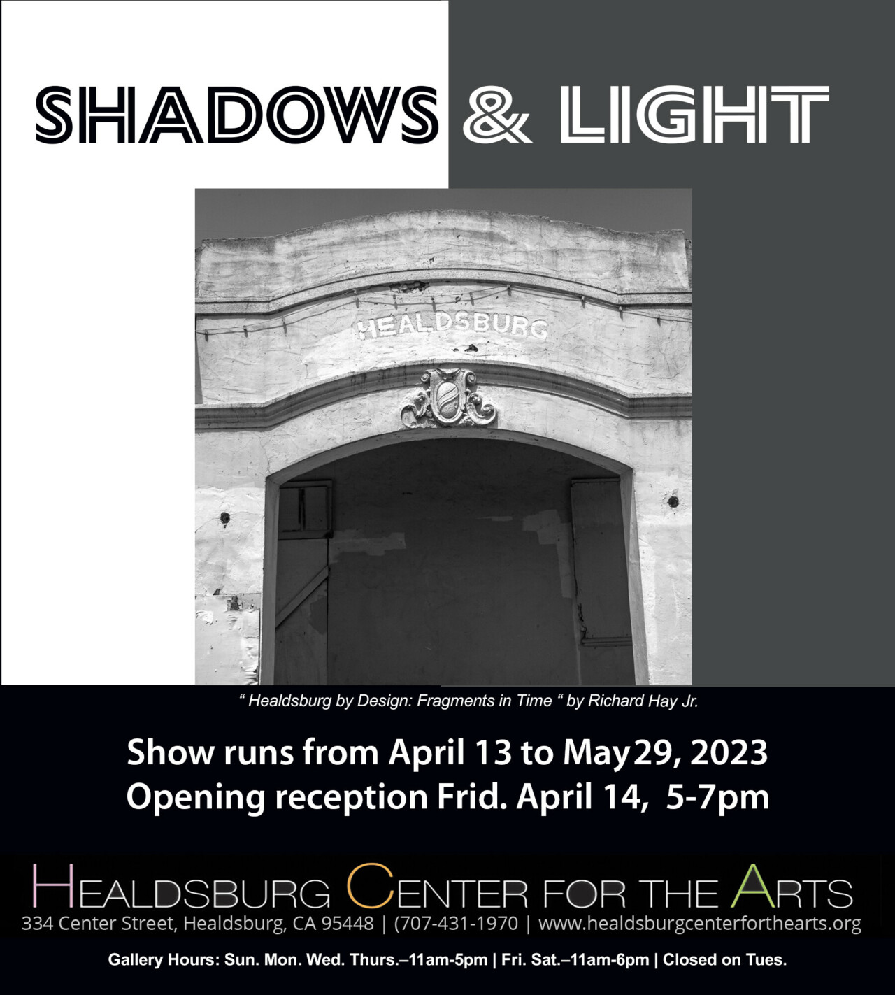 Showing art by 26 artists working in black, white, and gray. Local photographer Richard Hay Jr. debuts his series, Healdsburg by Design–Fragments of Time. The black and white images portray, in exquisite detail, the historic and contemporary structures that embody this 100+ year old town.