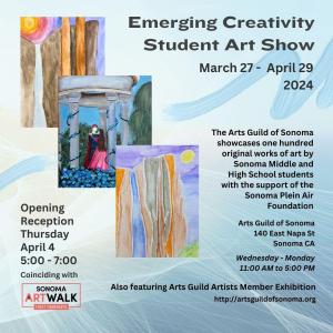Works by students from Altimira Middle School taught by Cheryl Coldiron and from Sonoma Valley High School taught by Renate Kuprian were created especially for this show. Also on view is work by twenty-two Arts Guild Artist Members.