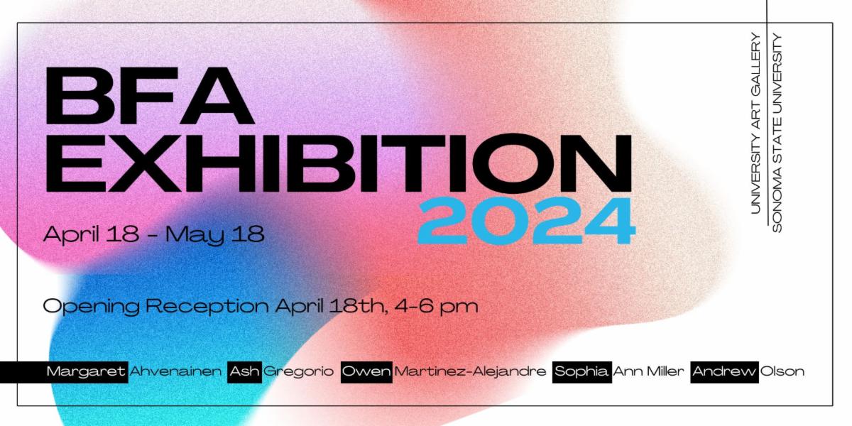 This annual Exhibition highlights the accomplishments of students graduating from the Bachelor of Fine Arts (BFA) program at SSU. This year the featured students are Margaret Avhenainen, Ash Gregorio, Owen Martinez-Alejandre, Sophia Ann Miller, and Andrew Olson.