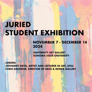 The Juried Student Exhibition features original artwork by current SSU Students in a variety of media, such as painting, sculpture, photography, printmaking, drawing, and mixed media, which reflects courses offered in the art studio program at Sonoma State as well as the students’ own individual creativity. This year’s jurors are Chris Grunder, Director of Bass & Reiner Gallery; and Jiovanny Soto, Artist and Lecturer in Art at San Francisco State University.